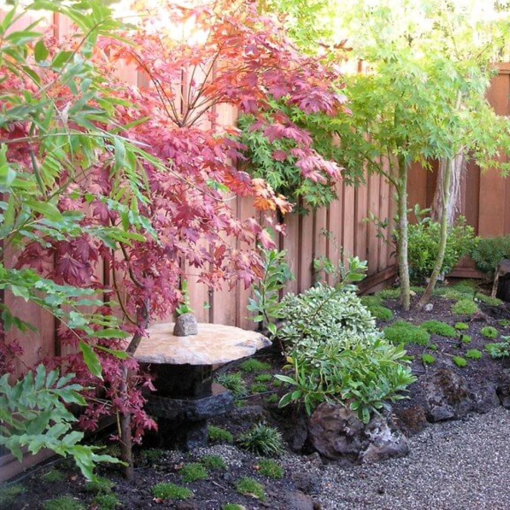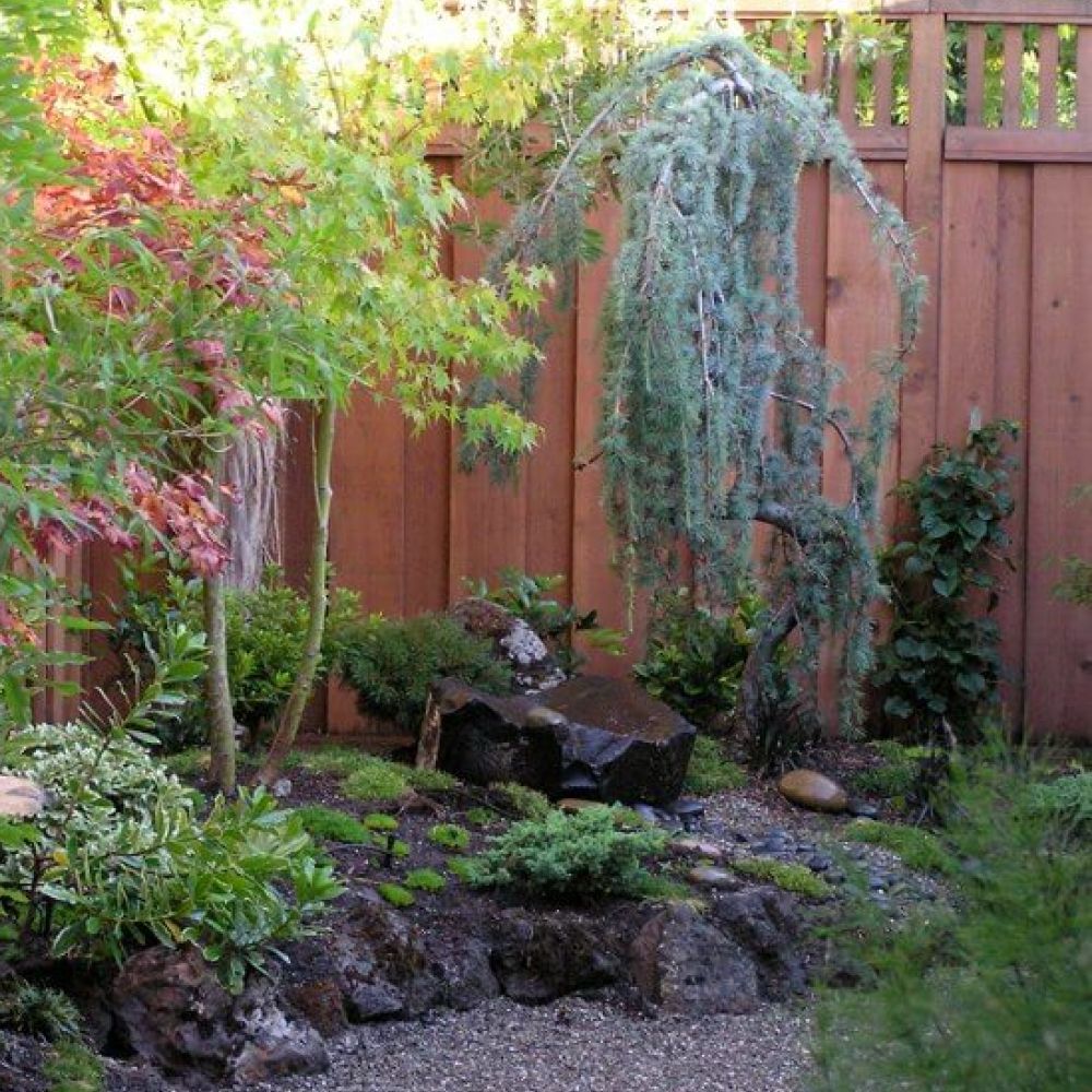 Japanese Garden Mountain View Japanese Lantern and Stone Raised Bed Wall Peaceful Buddha Blue Atlas Cedar Waterfall and Stone River Patio with Inlaid Slab need help with your garden? Contact us today to start your garden journey let's talk
