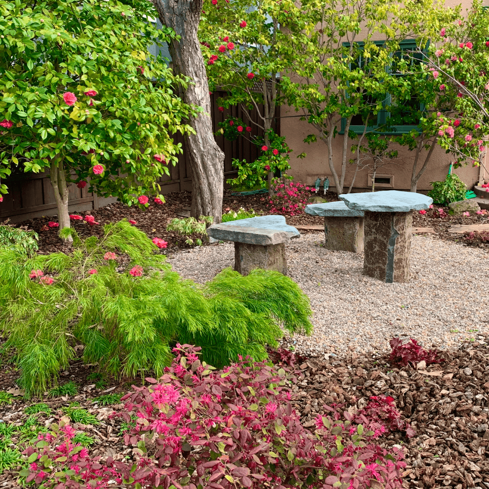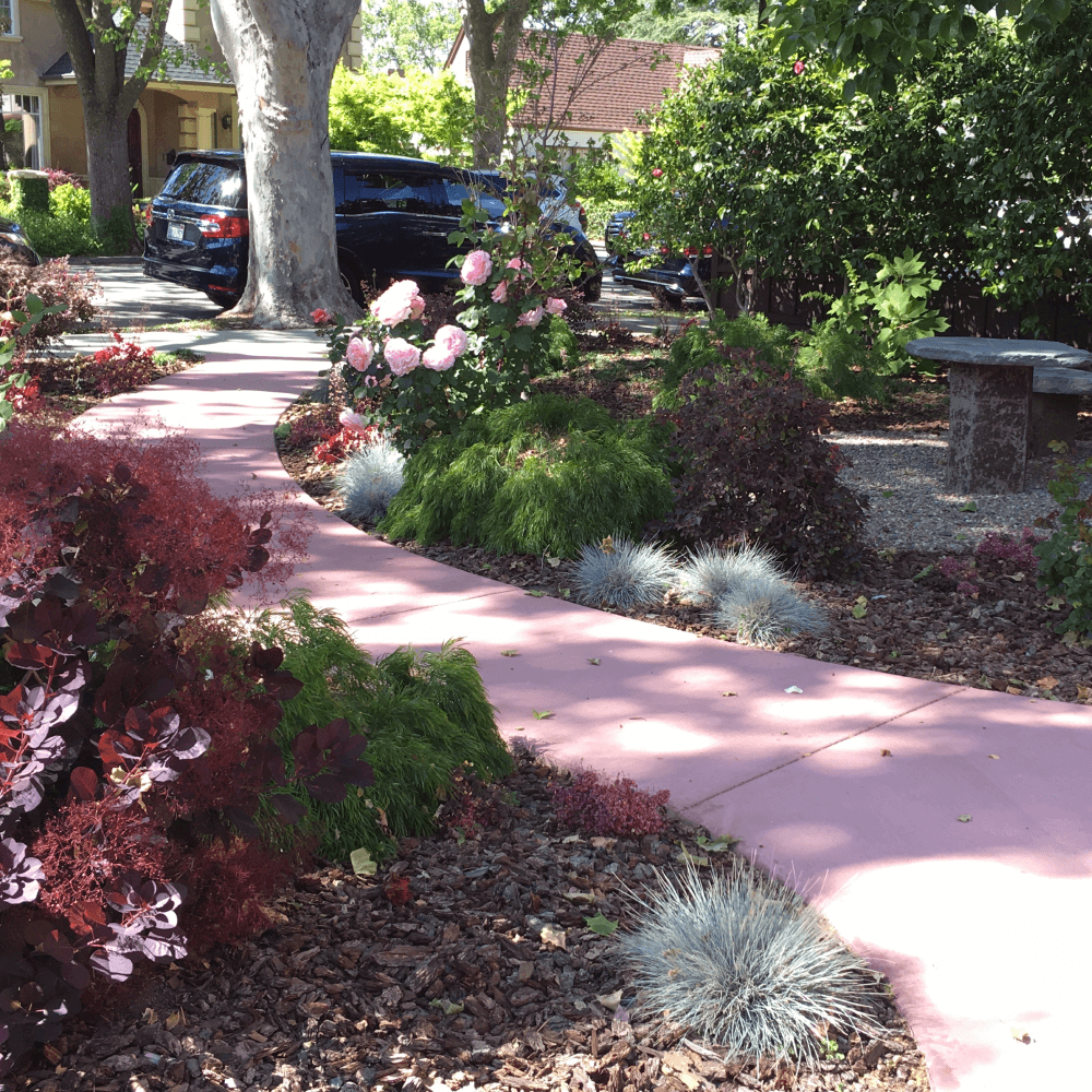 Welcoming Entry Palo Alto, CA Curved Entry Path Outdoor Seating, Custom Stone Furniture Pleasing Curved Path need help with your garden? Contact us today to start your garden journey let's talk